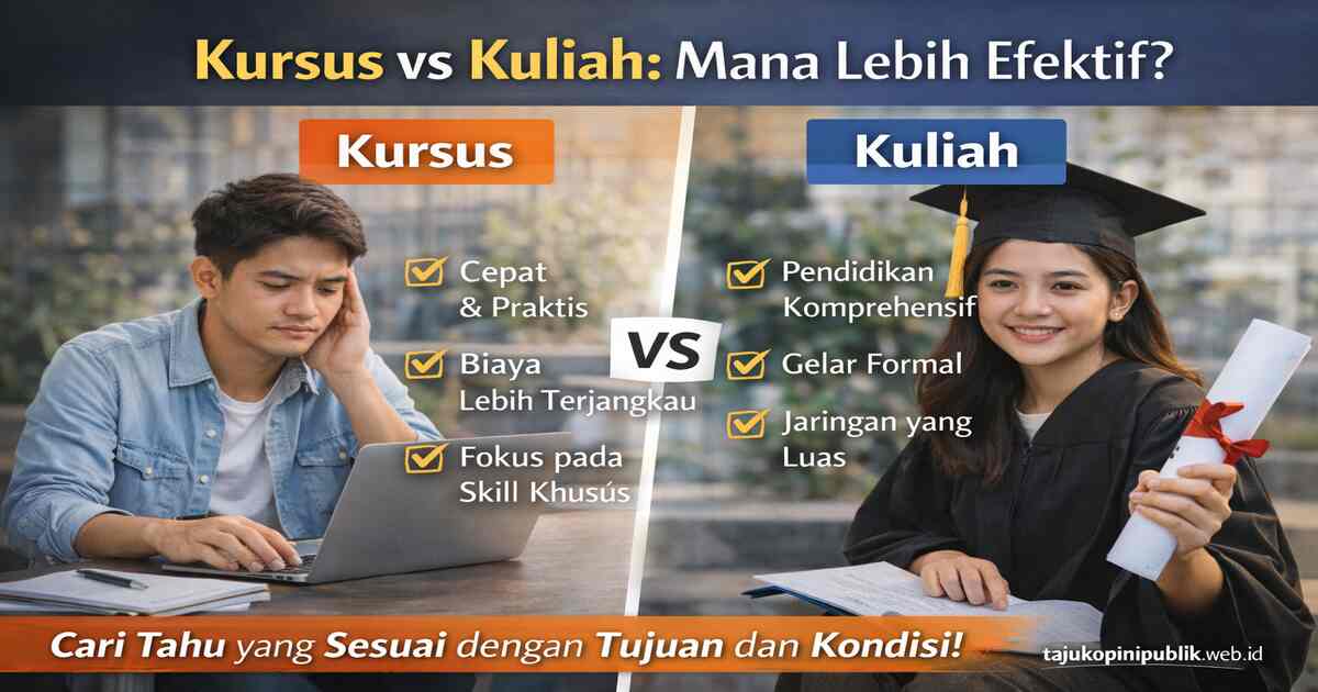 Analisis perbandingan kursus dan kuliah. Temukan mana yang lebih efektif untuk tujuan karier dan kondisimu.